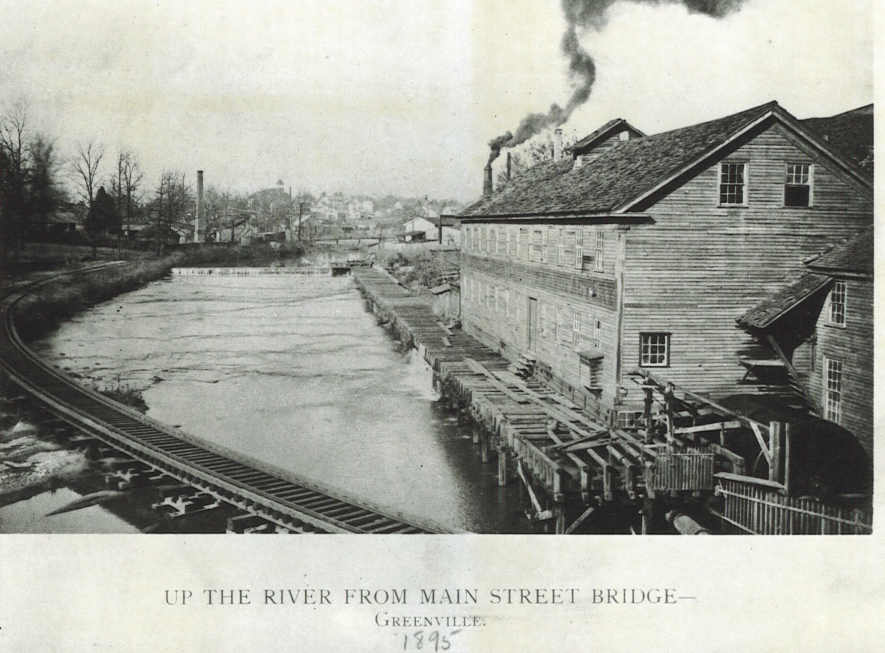 1890 - At this point, there were many thriving businesses on the river in Greenville’s downtown district including a lumber shed, a wheelhouse, a paint shop, a hardware store, and an office building.